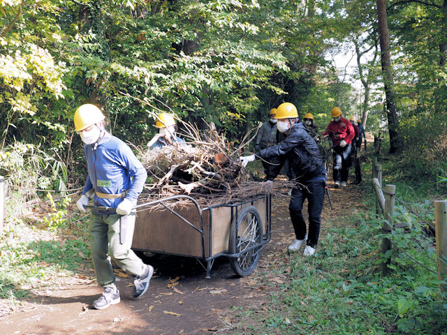 ▶緑地内に落ちた枯れ枝を集めて運んでいます。これにより笹刈り→落葉集めがスムーズにできるようになります。